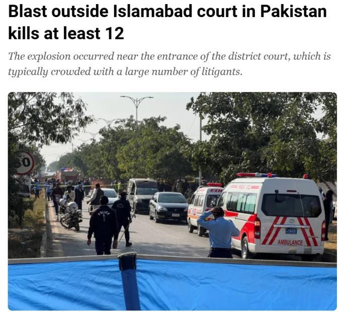 中新网11月11日电 据卡塔尔半岛电视台报道,巴基斯坦首都伊斯兰堡警方表示,当地时间11日,巴基斯坦首都伊斯兰堡一座法院大楼外发生爆炸,造成至少12人死亡、多人受伤。图片来源:半岛电视台报道截图,警方发言人表示:“我们正在调查爆炸的性质,目前尚不清楚进一步的细节。”爆炸发生在伊斯兰堡地方法院入口附近,那里通常挤满了大量诉讼当事人。