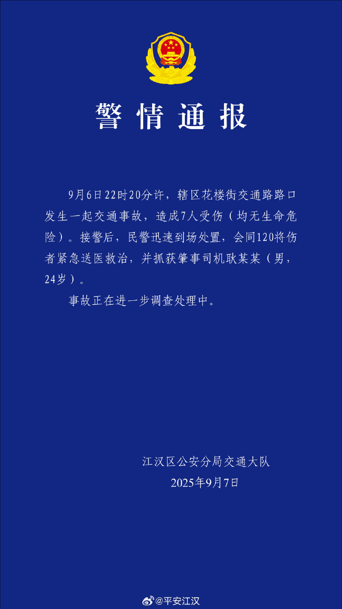 CCTV新闻:根据 @Ping'an Hanjiang的说法,9月6日左右,在该地区的Hualou Street和Jiao Road的交叉路口发生了交通事故,导致7人受伤(所有这些人都没有生命的风险)。接到电话后,警察迅速到达现场处理,并与120人合作将受伤的人送往医院接受治疗,并逮捕了驾驶员Geng Moung Moung Moung(男人,24岁)。事故正在进一步调查和处理。