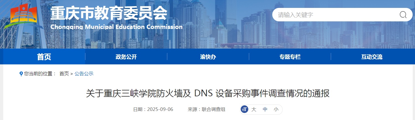 On September 6, the Chongqing Joint Investigation team released a "notice of the Firewall Investigation and DNS Equipment Procurement Incident incident of Chongqing Three Gorges College", with full text as follows: Previous Report recently, a netizen posted a message that states "announcement in the winner (transactions) Firewall and DNS Equipment Procurement (CQS25A00333) May 2025, the winning price of the "Pulian tl-r473g出口防火墙是由全平三高尔斯学院购买的每单位850,000元的,但该产品模型在官方旗舰店出售了一个特定的电子商务平台,Pulian,Pulian,价格只有299元,他被询问Purlian在线购物平台Purlian Store Store Sote Sote Sote YU YUUS TABLIAN THES STORE MODER YUUS YUUS TLL-R473G 299 YUAN 299 YUA TL-R473G是一款不支持防火墙的路由器,该产品的价格为850,000元,其价格为299元。,Pulian TL-R473G价格也约为数百人。一位长期参与网络安全的行业内部人士告诉JIMU新闻,根据获胜的竞标公告的内容,目标“出口防火墙产品”实际上不是防火墙,而是企业级出口路由器。此外,Pulian TL-R473G型号单位价格只有几百元,远距到目标的每单位850,000元。记者搜查了此事,发现2025年5月10日晚上10点左右,中国政府采购网络发布了“终止了重庆三戈尔斯大学防火墙和DNS设备采购(CQS25A00331)的通知”。校正信息列显示:“消费者接受的通知表明,原始交易供应商Fengdu County Hongzheng Trading Co,Ltd的主要目标'出口防火墙产品模型是路由器产品模型。未能满足文档,并且该项目发生的是影响公平的非法和不规则行为。 “政府管理管理法规有关获得方式的法规”,消费者决定终止对该项目的收购并重新参与收购活动。 “更正的日期是2025年5月10日。